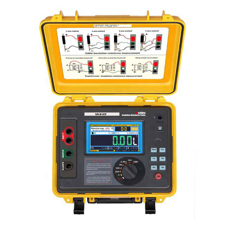 VS-3127 The VS-3127ການທົດສອບຄວາມຕ້ານທານຂອງ insulation ຂອງຫມໍ້ແປງສະຫນອງຄວາມສາມາດໃນການປະຕິບັດການວັດແທກຄວາມຕ້ານທານຂອງ insulation ທີ່ຖືກຕ້ອງເຖິງ 15 kV ແຮງດັນການທົດສອບຄວາມຕ້ານທານສູງສຸດຂອງ 30 TΩ. ຄວາມຖືກຕ້ອງຂອງການວັດແທກຄວາມຕ້ານທານແມ່ນ ± 5 % ຈາກ 1 MΩ ເຖິງ 3 TΩ! ສໍາລັບບໍລິສັດສາທາລະນູປະໂພກ ແລະບໍລິການ, VS-3127 ແມ່ນຕົວທົດສອບທັງໝົດທີ່ມີຄວາມຍືດຫຍຸ່ນ ແລະຄວາມສາມາດໃນການພິສູດໃນອະນາຄົດ. Weshine VS-3127 ຖືກອອກແບບເພື່ອເຮັດວຽກຢູ່ບ່ອນໃດກໍຕາມທີ່ທ່ານເຮັດວຽກ. ແຮງດັນຜົນຜະລິດສູງສຸດເຖິງ 7 ເກຍ (250V, 500V, 1KV, 2.5KV, 5KV, 10KV, 15KV). ກະແສໄຟຟ້າສັ້ນສູງສຸດ 7mA ການທົດສອບຄວາມຕ້ານທານຂອງ insulation (IR), ການທົດສອບດັດຊະນີ polarization (PI), ການທົດສອບອັດຕາສ່ວນການດູດຊຶມ dielectric (DAR). ໂໝດການທົດສອບທາງລາດ (RAMP), ໂໝດການທົດສອບຄວາມຕ້ານທານທີ່ຖືກກັ່ນຕອງ (FR). * ການທົດສອບຄວາມສາມາດ (ຫລວງ). ການທໍາງານຂອງຈໍພາບແຮງດັນ, ອັດຕະໂນມັດການຕິດຕາມແຮງດັນທີ່ມີຊີວິດຂອງການວັດແທກ
