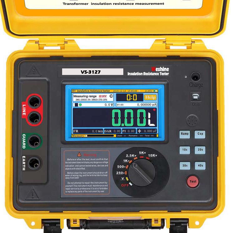 VS-3127 The VS-3127ດັດຊະນີ Polarization ຂອງ Transformerສະຫນອງຄວາມສາມາດໃນການປະຕິບັດການວັດແທກຄວາມຕ້ານທານຂອງ insulation ທີ່ຖືກຕ້ອງເຖິງ 15 kV ແຮງດັນການທົດສອບຄວາມຕ້ານທານສູງສຸດຂອງ 30 TΩ. ຄວາມຖືກຕ້ອງຂອງການວັດແທກຄວາມຕ້ານທານແມ່ນ ± 5 % ຈາກ 1 MΩ ເຖິງ 3 TΩ! ສໍາລັບບໍລິສັດສາທາລະນູປະໂພກ ແລະບໍລິການ, VS-3127 ແມ່ນຕົວທົດສອບທັງໝົດທີ່ມີຄວາມຍືດຫຍຸ່ນ ແລະຄວາມສາມາດໃນການພິສູດໃນອະນາຄົດ. Weshine VS-3127 ຖືກອອກແບບເພື່ອເຮັດວຽກຢູ່ບ່ອນໃດກໍຕາມທີ່ທ່ານເຮັດວຽກ. ແຮງດັນຜົນຜະລິດສູງສຸດເຖິງ 7 ເກຍ (250V, 500V, 1KV, 2.5KV, 5KV, 10KV, 15KV). ກະແສໄຟຟ້າສັ້ນສູງສຸດ 7mA ການທົດສອບຄວາມຕ້ານທານຂອງ insulation (IR), ການທົດສອບດັດຊະນີ polarization (PI), ການທົດສອບອັດຕາສ່ວນການດູດຊຶມ dielectric (DAR). ໂໝດການທົດສອບທາງລາດ (RAMP), ໂໝດການທົດສອບຄວາມຕ້ານທານທີ່ຖືກກັ່ນຕອງ (FR). * ການທົດສອບຄວາມສາມາດ (ຫລວງ). ການທໍາງານຂອງຈໍພາບແຮງດັນ, ອັດຕະໂນມັດການຕິດຕາມແຮງດັນທີ່ມີຊີວິດຂອງການວັດແທກ